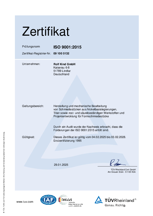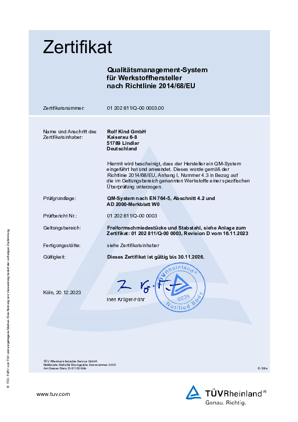 Our QA system as a manufacturer of free-form forgings is based on various certifications, including DIN EN ISO 9001-2018, PED 97-23-EC, AD2000-WO, NORSOK M650 or the French standard for nuclear applications RCC-MR. We meet all customer-specific standards and approval requirements.Our multi-certified quality management ensures that these high requirements are met. For us, "Made in Germany" not only means manufacturing at an internationally recognized level, but is also a guarantee of the highest standards. We work in close cooperation with all leading approval bodies such as TÜV Rheinland, TÜV Süd, DEKRA, DNV-GL, LR, ABS, etc.